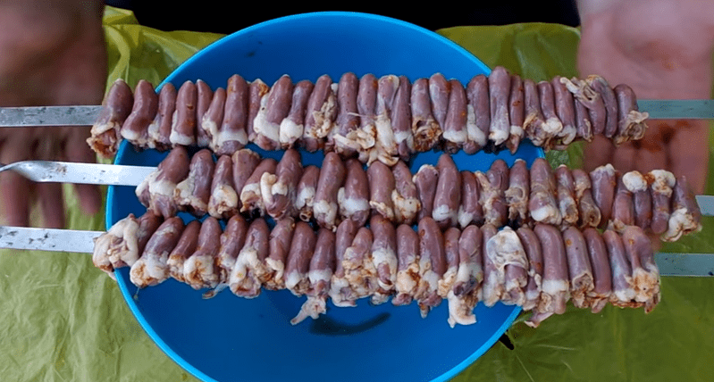 В томатном соке также хорошо вымачиваются все части куриной тушки. Для примера, я возьму самый быстрый вариант шашлыка на основе сердечек. Их даже делить не нужно, только промыть и сполоснуть.
