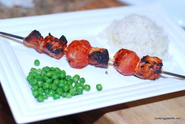 Нанизать кусочки курицы и помидоры черри на шампуры (деревянные предварительно замочить на минимум 30-40 минут в воде). Поместить шампуры на противень и готовить в нагретой духовке примерно 10 минут, перевернув шашлыки после 6-7 минут. Точное время готовки (+ 2 минуты) зависит от характеристик духовки, размера кусков курицы и качества куриных грудок.