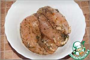 Замаринуем грудку в подсолнечном масле, пряных травах, меде и соевом соусе. Чуть подсолите. Очень вкусный пикантный маринад с нотками востока. Оставьте грудку мариноваться на пару часов. Можно поставить на ночь в холодильник.