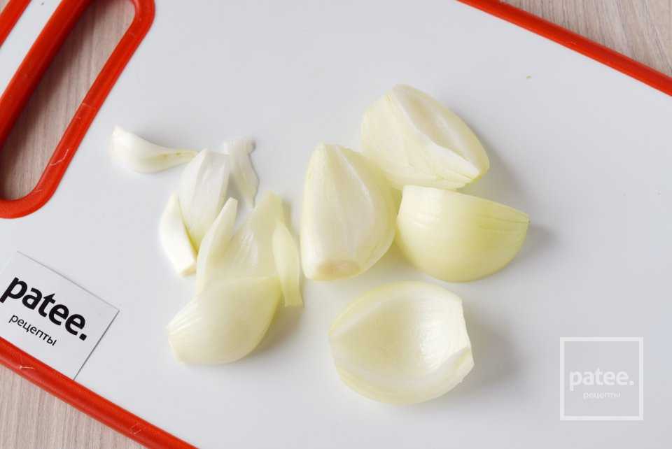 - Кольцами необходимо уложить луковые кольца поверх лаврушки и только потом мясо.