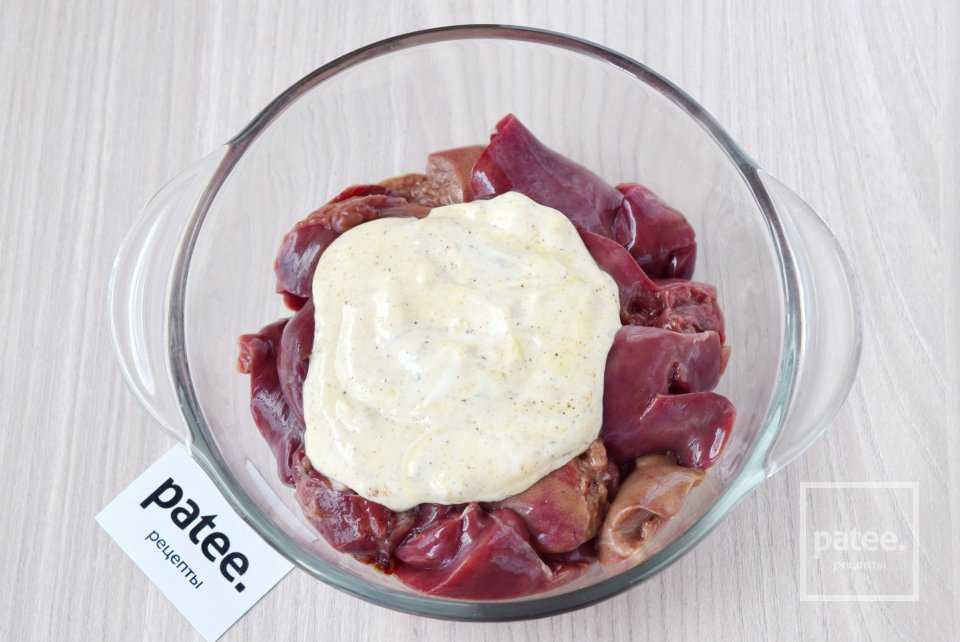 - Заранее нарезанную печень покрываем готовым маринадом.
