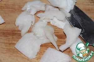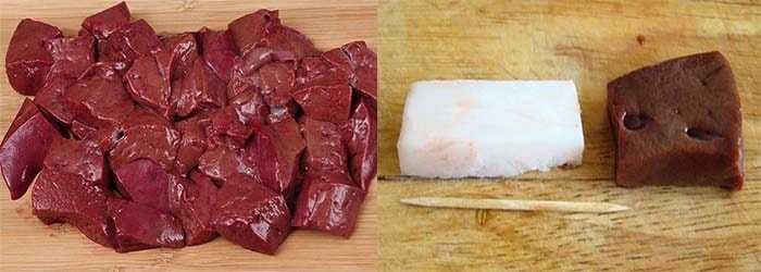 Печень освободить от пленки, протоков, нарезать на кусочки 3 — 4 см.. Промыть и обсушить.