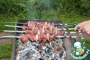 Обжаривать шашлычки на углях, внимательно наблюдая за процессом обжаривания, не допускать пересушивания.