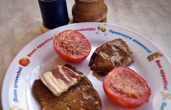 Сказать, что это вкусно, это ничего не сказать, это невероятно пикантное сочетание – печень со скворчащими шкварками и взрывающимся помидорным соком. М-м-м, я Вам завидую, в первый раз это поистине гурманское наслаждение…. Удачи!