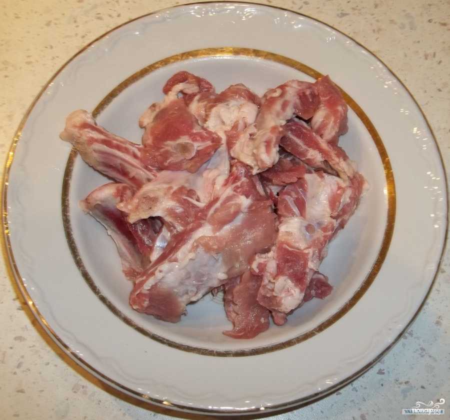 - Свиную грудинку разрубите на куски по 3 ребра. Пленку между ребрами надрежьте в центре.