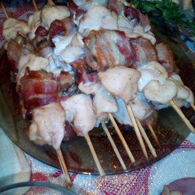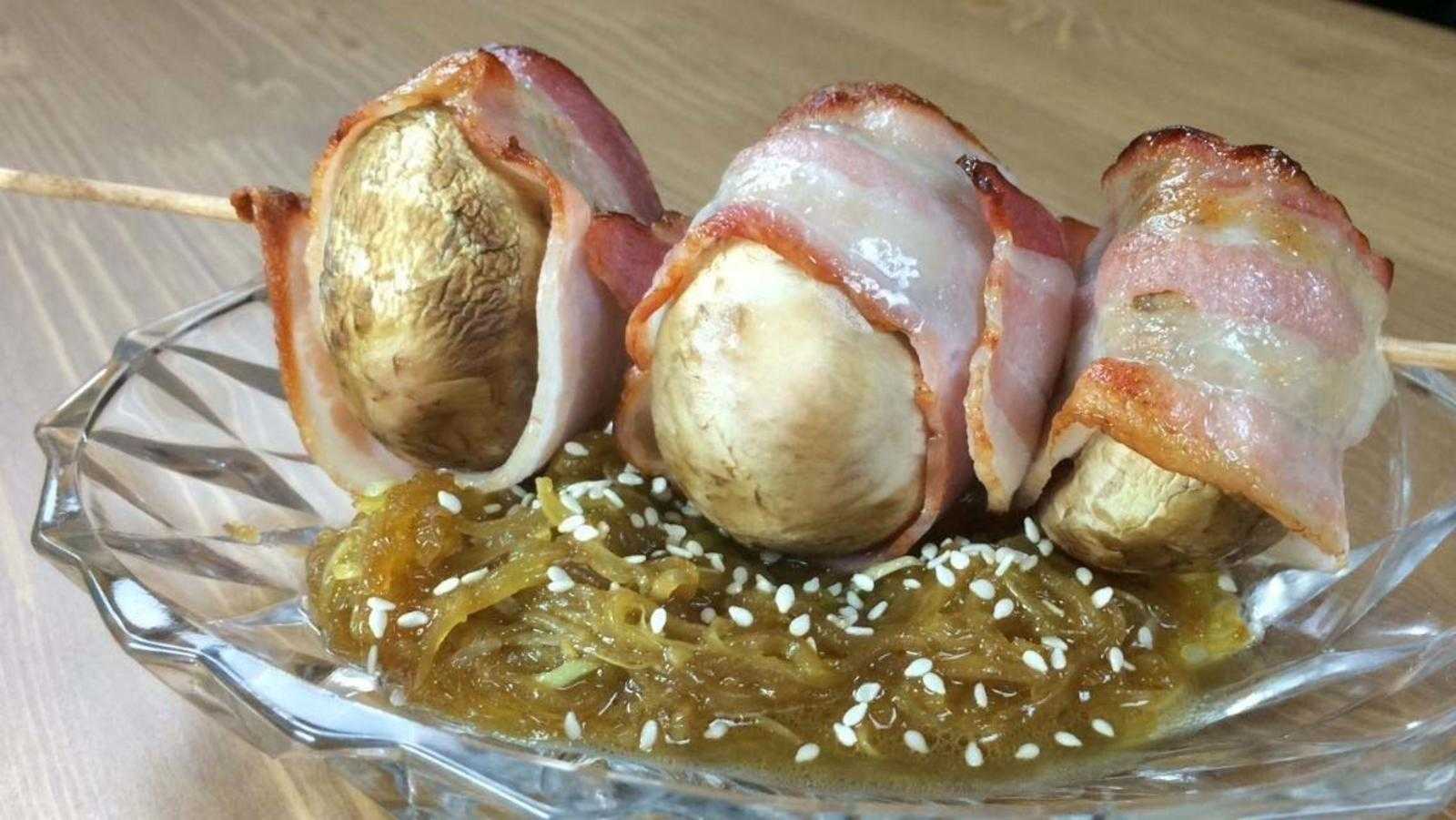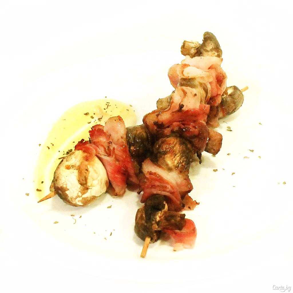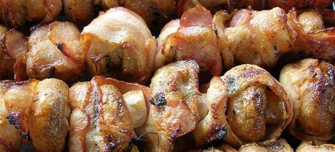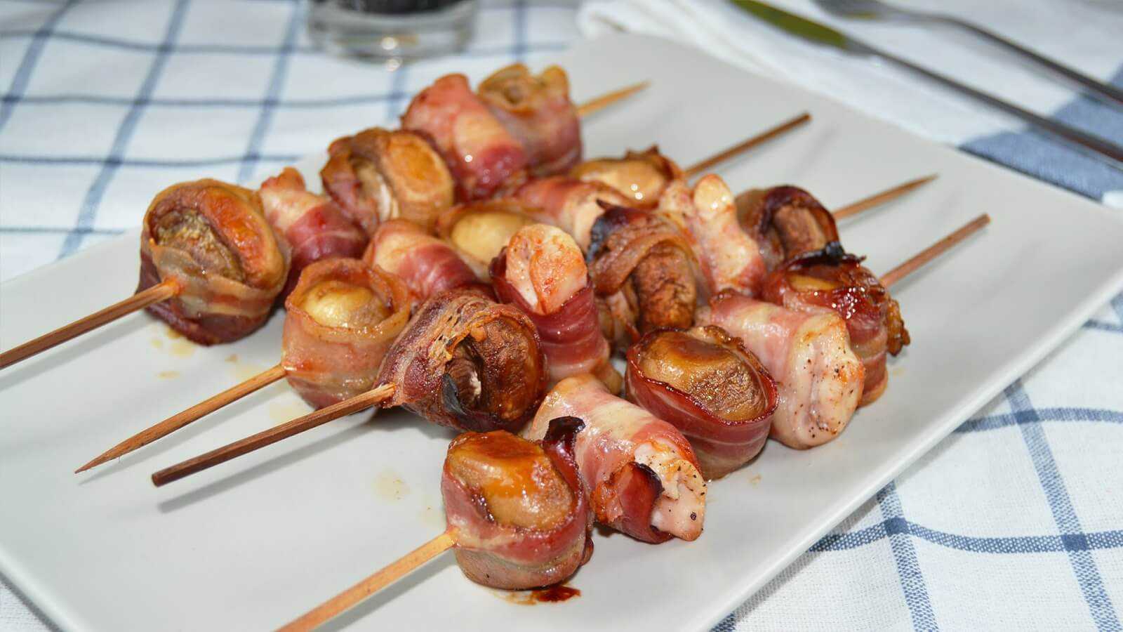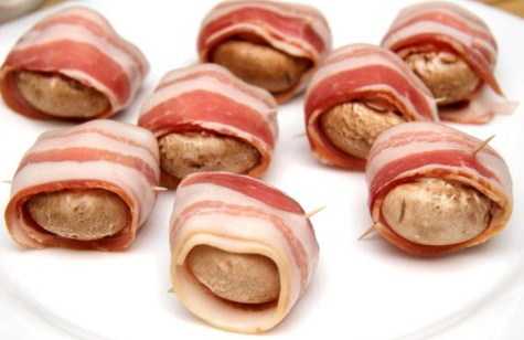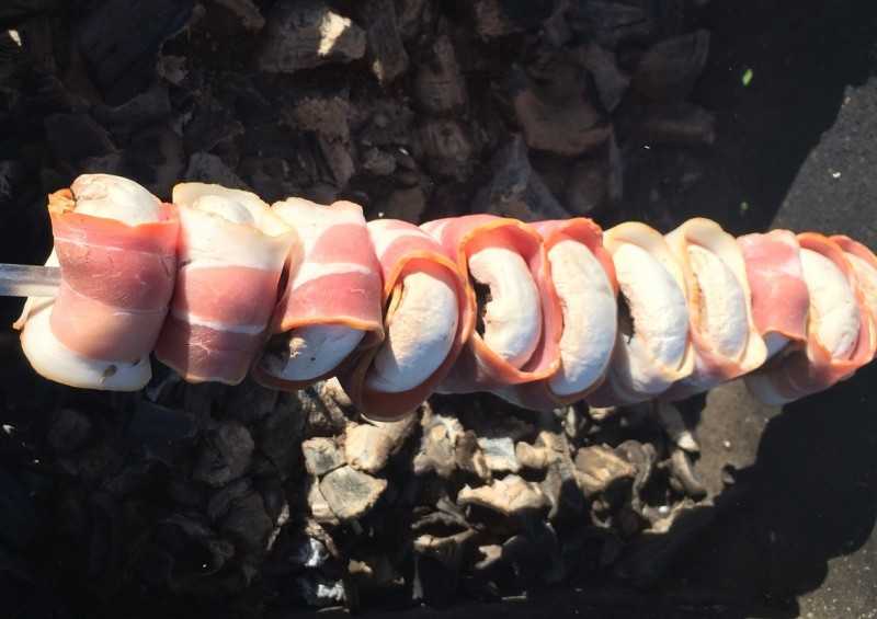 - Каждый грибок обернуть полоской бекона, аккуратно надеть на шампур.