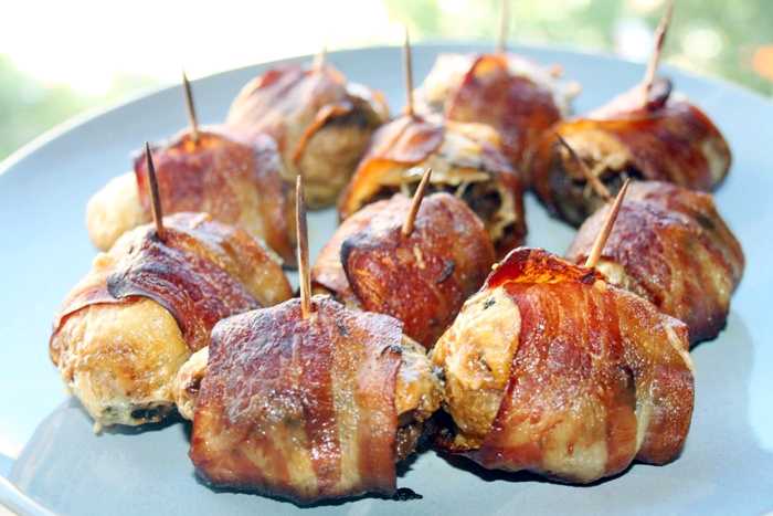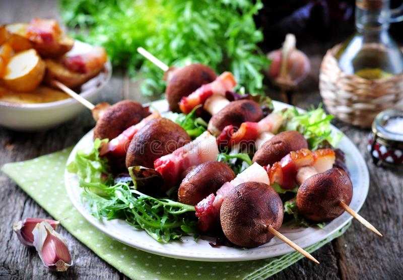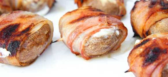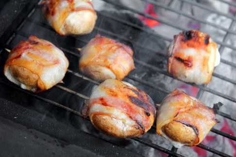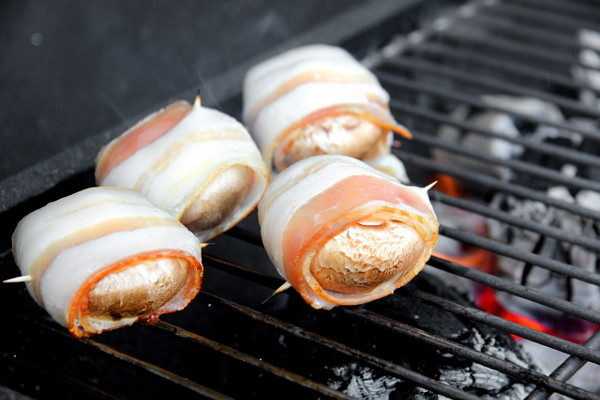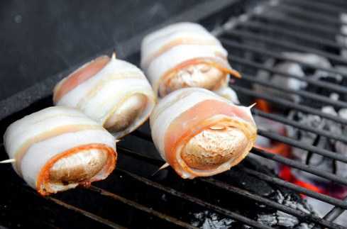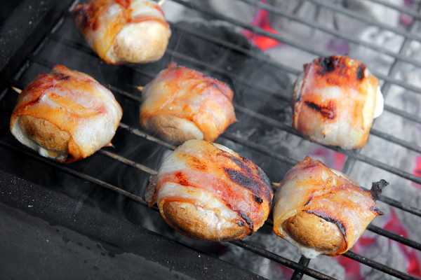 – Можно удалить у грибов ножки, а оставшиеся шляпки начинить сыром, а затем уже завернуть все в бекон и пожарить на мангале. Получатся фаршированные сыром шампиньоны — тоже очень вкусное блюдо.