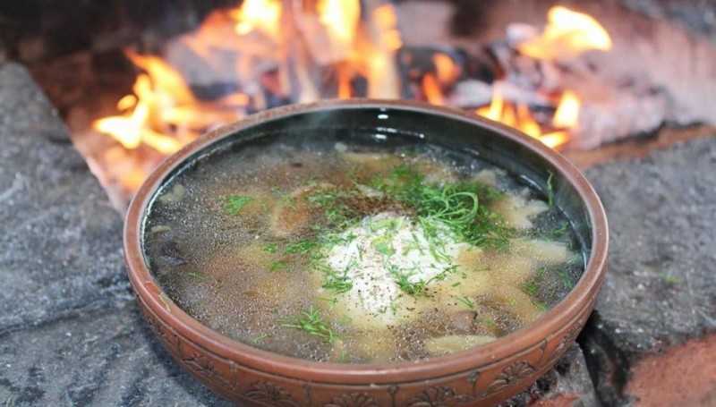 Суп на костре варится до полной готовности всех составляющих продуктов. В конце добавляется много зелени и две ложки растительного масла.