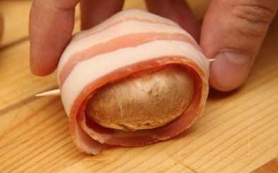 Каждый шампиньон нужно завернуть в отдельный кусочек бекона и закрепить все небольшими деревянными шпажками, или надев на шампур, как шашлыки. Дальше можете окунуть завернутые в бекон грибы в любой соус по вашему выбору, или посыпать все солью и специями, чтобы добавить вкуса.