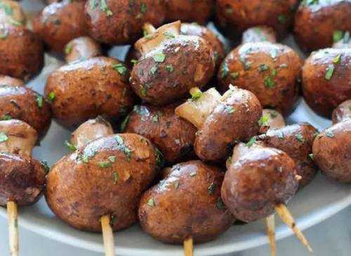- На мангале шампиньоны готовят как с использованием решетки, так и насаживая их на шампуры. Можно оставить их как есть или завернуть в пищевую фольгу. Если речь идёт о домашнем приготовлении в духовке, то удобнее будет использовать шпажки, сделанные из дерева. Они легче входят в мякоть гриба, не разламывая её.