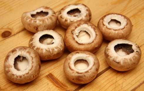 - Промойте грибы, обсушите их бумажными салфетками. Укоротите у шампиньонов ножки, чтобы они выступали из-под шляпок не слишком сильно.