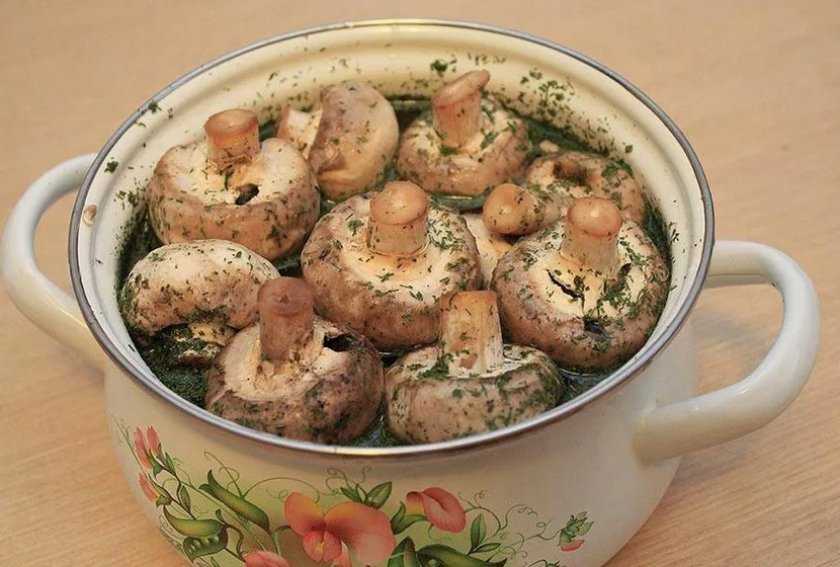 – Если в процессе жарки шампиньоны начнут подгорать сверху, поливайте их оставшимся маринадом.