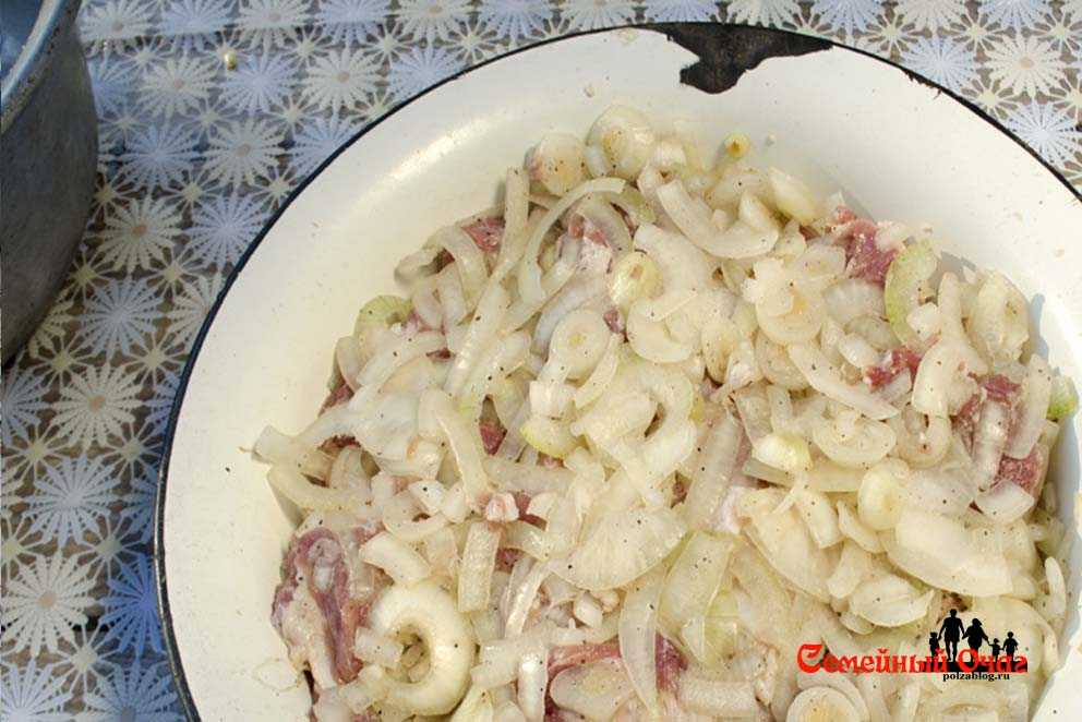 - В миску, подходящую для маринования, положить мясо, на него – лук и приправы. На этом этапе соль не добавлять. Как следует перемешать, чтобы каждый кусочек был обвалян в специях.