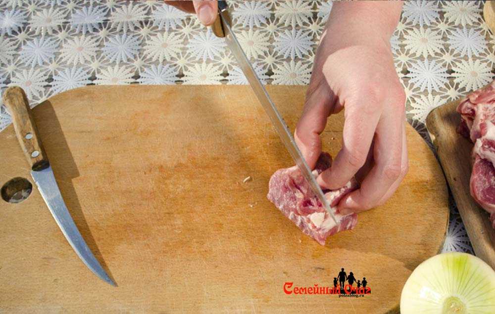 Для шашлыка из свинины лучше всего выбирать ошеек или шею. Нарезаем мясо равными кусками шириной сторон 3-5 см. При желании можно сделать небольшие надрезы или проколы вдоль волокон, но это не обязательная процедура.