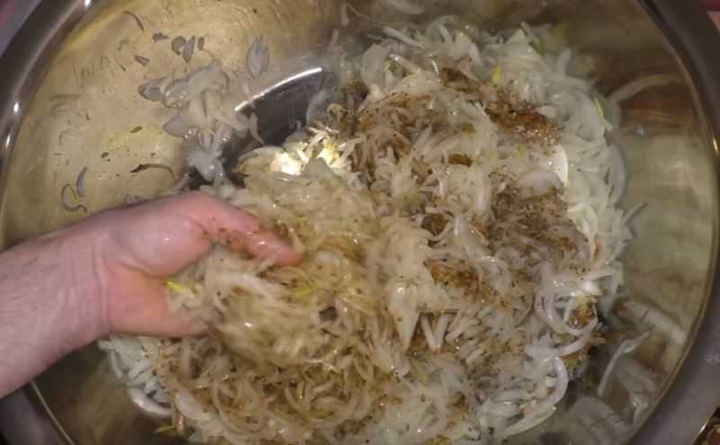 1. Лук нарежьте мелкими полукольцами. Его соотношение к мясу 1:1, берите столько же сколько у вас мяса. Посолите, добавьте приправы и пожамкайте лук хорошенько руками, чтобы дало сок.