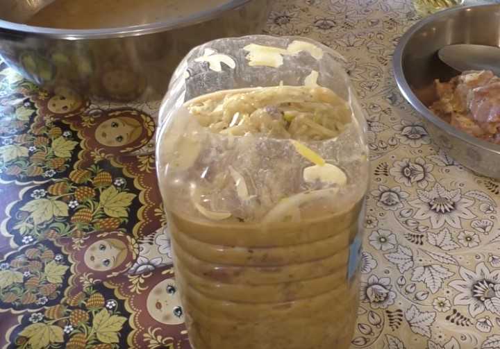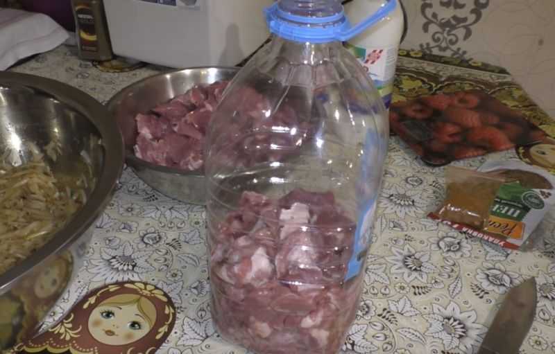 2. Возьмите пластиковую бутылку с крышкой на 5 литров и положите туда мясо на 1/3 часть.