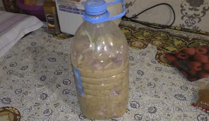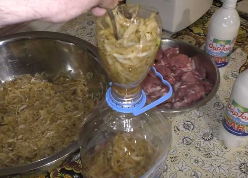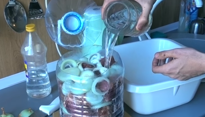 5. Теперь берем 3х литровую стеклянную банку или пластиковую 5 литровую со срезанным верхом и выкладываем слоями лук и мясо, начиная со слоя лука. Когда все ингредиенты будут в банке, наливаем сверху уксусный раствор, и хорошенько придавливаем руками мясо сверху и ждем пару минут, чтобы оно получше утрамбовалось и вышел лишний воздух.