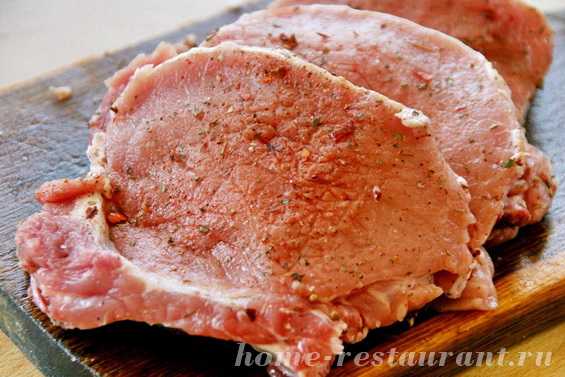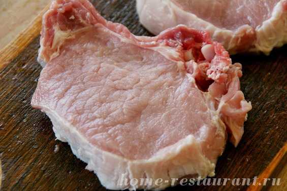 Вырезку с косточкой моем, обсушиваем бумажным полотенцем или салфетками. Разрезаем на порционные куски. Сделать это достаточно просто – ведь у нас есть отличный указатель – ребра. Нам надо лишь разрезать мясо так, чтобы каждое ребрышко приходилось на 1 кусок. При этом стейк получается достаточно толстый – 2-3 см. Пусть вас это не смущает, при правильном процессе приготовления он хорошо пропечется и не будет сырым.