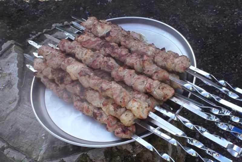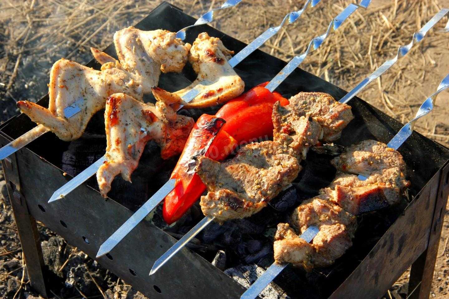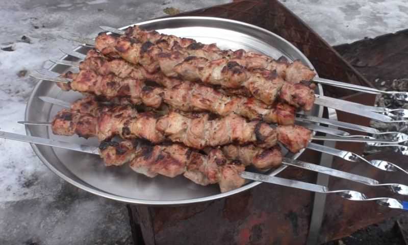 Острый конец шампура должен оставаться свободным, длина свободного конца должна быть не менее 5 см. Подготовленные шампуры выкладываем на мангал с «седыми» угольками плотно. Чтобы мясо хорошо прожарилось, необходимо периодически поворачивать шампуры, а также менять их местами, так как в центре мангала нагрев, как правило, более сильный, чем по краям.