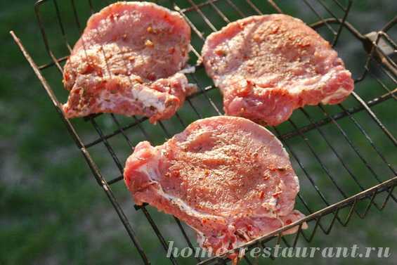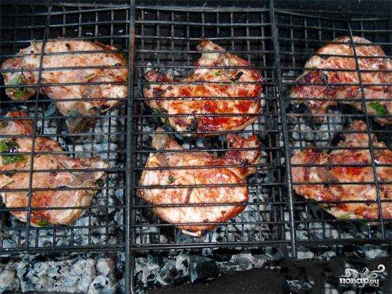 Если мясо готовим на решетке, то его нужно нарезать плоскими кусочками и замариновать. Подготовленные куски свинины выкладываем на смазанную растительным маслом решетку. Закрываем второй частью решетки и закрепляем. Жарим несколько минут с одной стороны, затем переворачиваем и поджариваем со второй стороны. В среднем на жарку свинины уходит около четверти часа. В процессе обжаривания не рекомендуется протыкать мясо вилкой или ножом, иначе сок вытечет.