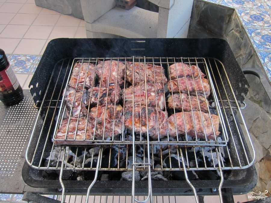 Достаем его из холодильника и выкладываем на решетку барбекю или мангала. Когда кусочки свинины начнут слегка поджариваться с нижней стороны, с помощью кухонных щипцов переворачиваем их