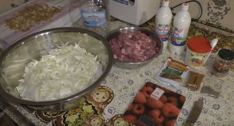 Тем временем подготавливаем мясо и лук. Свинину нарезаем порционными кусочками, а лук кольцами.