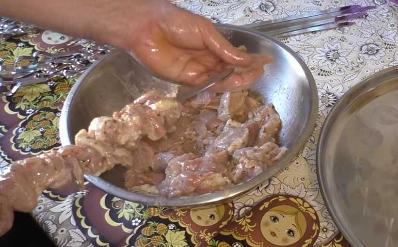 6. Обильно полейте его растительным маслом, чтобы смазался каждый кусочек, дайте настояться еще полчаса и можно нанизывать его на шампура.