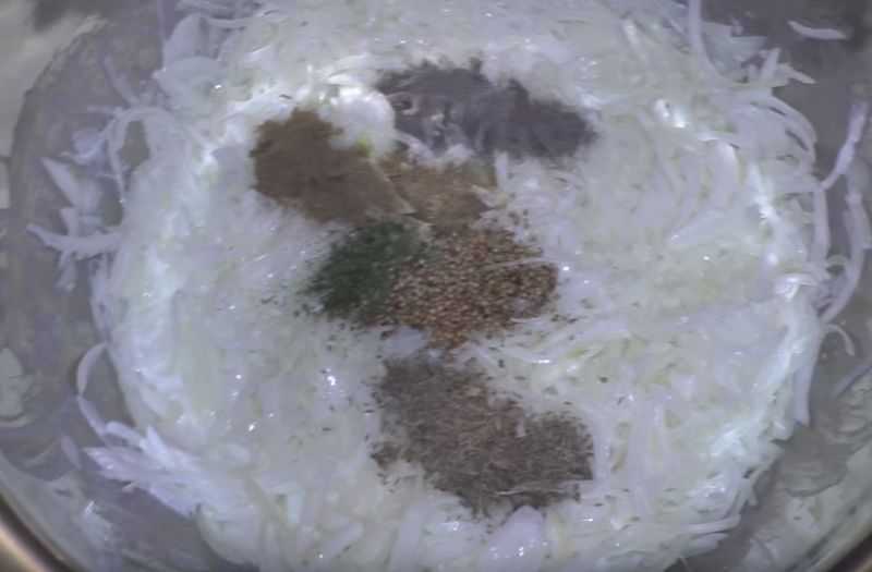 2. Нарежьте лук полукольцами и положите в чашу кефира. Добавьте три чайные ложки соли и разомните руками, чтобы лук стал мягким и дал сок. Высыпьте туда все приправы и перемешайте.