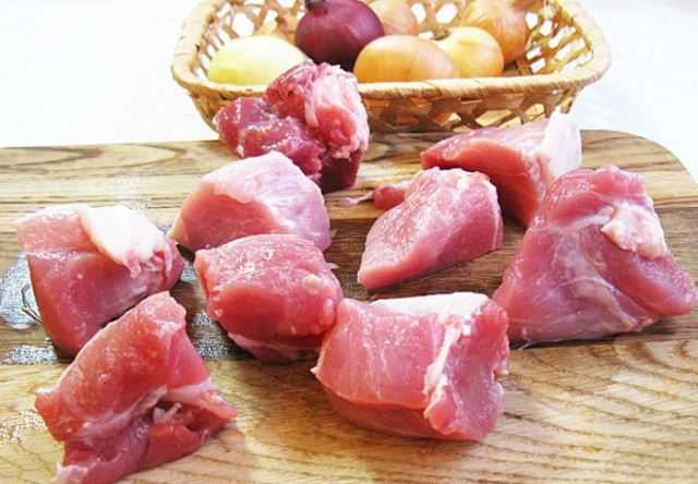 2. Свинину моем и нарезаем на достаточно крупные куски. Грубо говоря, длина такого куска может достигать 6 см, а толщина- 4 см.