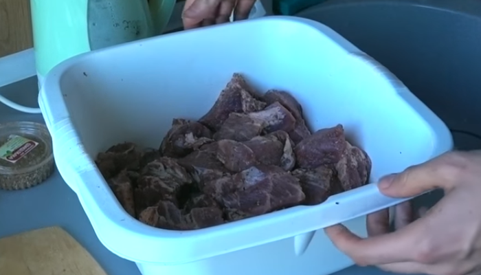 1. Нарежьте мясо небольшими кусочками, не больше спичечного коробка и уложите в трехлитровую банку, положите туда три чайные ложки с горкой соли. Все залейте минеральной водой «Ессентуки» до краев. Чтобы газ не выходил, закройте банку плотно крышкой. И оставьте замачиваться на 1-1,5 часа. После этого минералку нужно слить.