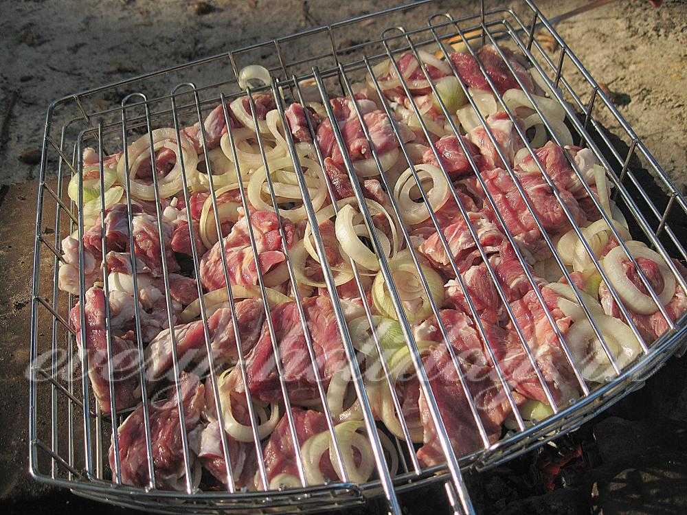 - Если любите жаренный лук, то нанизывайте его поочередно с мясом на один шампур. И не бойтесь, что он сгорит. Сгореть может только верхний слой, а все что под ним- ваша законная добыча.