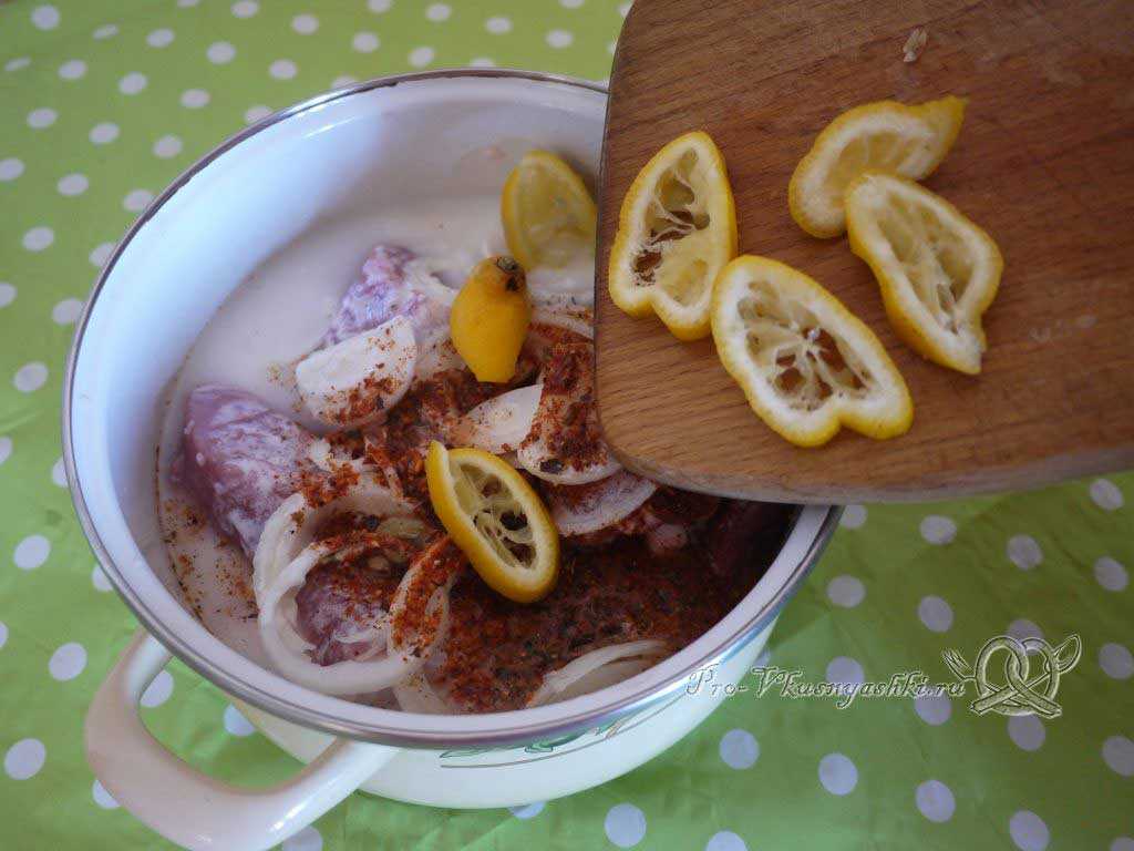Как приготовить? Промываем, обсушиваем бумажным полотенчиком и нарезаем мясо. Наиболее подходящий размер кусочков – 4-5 см. Лук очищаем, режем широкими колечками. Досыпаем приправы, размешиваем. Отправляем сюда лучок и опять перемешиваем, сюда же добавляем чеснок. Лимоны промываем, режем пополам. Выжимаем сок сразу на мясо. Можно натереть немного цедры, так получится еще ароматнее.