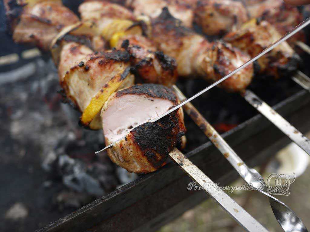 Чтобы сохранить всю сочность нанизанные кусочки поджаривают при высокой температуре. Данное действие приведет к моментальному образованию поджаристой корочки, а это сохранит всю сочность внутри и не позволит выбежать соку. Затем нужно снизить температуру или огонь, чтобы дожарить до белого мяса. Если мясо розовое, значит, его следует готовить еще.