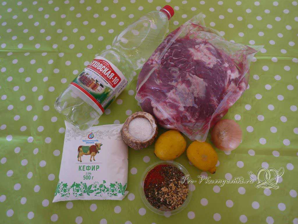 Подготовим ингредиенты. Свинину извлекаем из упаковки. Промываем мясо и лимоны под струей холодной воды. Луковицу чистим от кожуры. Жирность кефира не принципиальна.