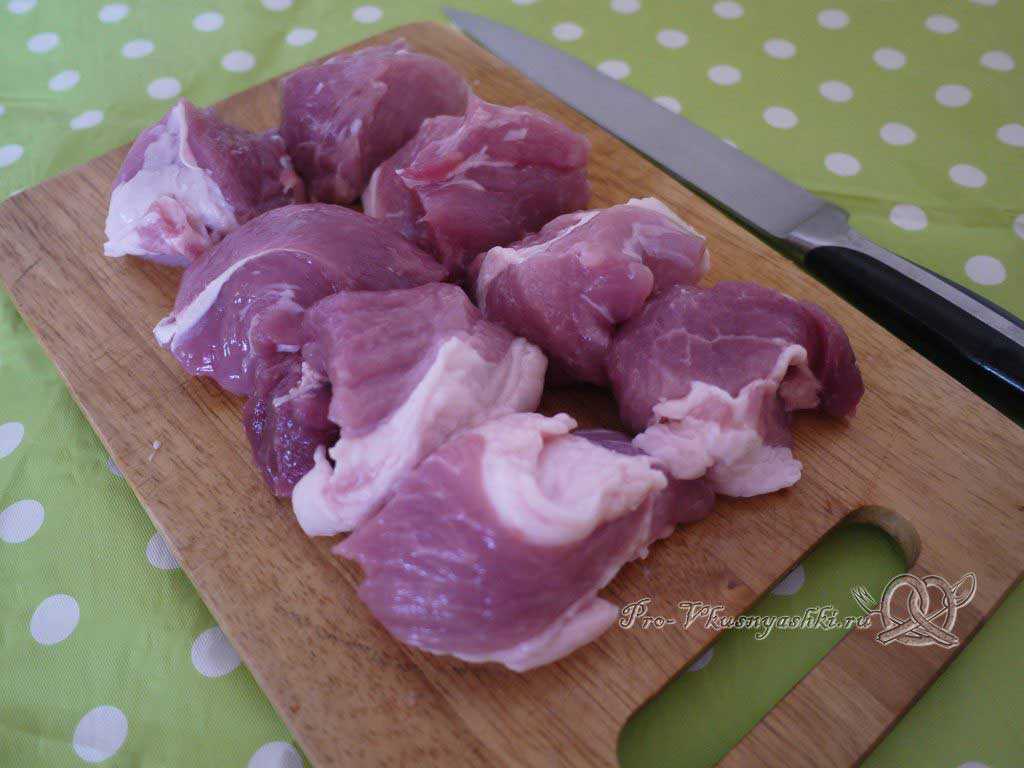 Нарезаем мясо на кусочки размером примерно 8х8 см. Это не абсолют, Вы можете выбрать иные пропорции, но в данном случае процесс приготовления займет меньше времени, свинина отлично пропитается рассолом и прожарится равномерно.