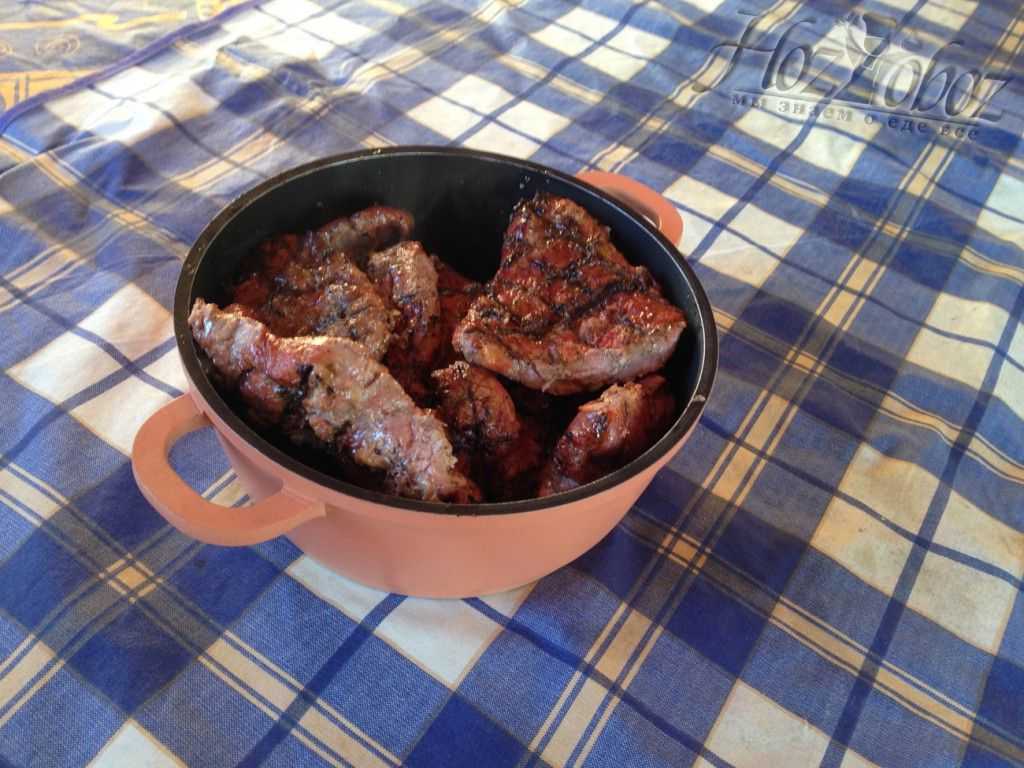 - Мясо будет готово когда перестанет идти кровь при надрезе, но сок должен выделяться, иначе мясо будет пересушенным. Следите внимательно чтобы оно оставалось сочным. Если вы используете домашний мангал как у нас, то лучше снять мясо пораньше, когда оно еще будет с кровью, переложить в жаропрочную кастрюлю и дать ему постоять рядом на горелке около костра еще минут 10-15. Так оно получится особенно сочным и вкусным.