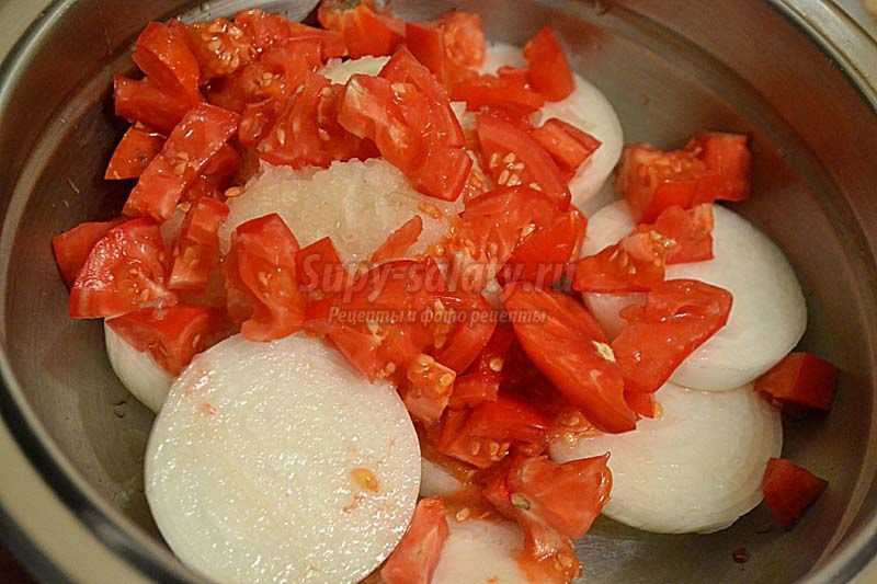 Несколько средних томатов порежьте кубиками и добавьте к луку.