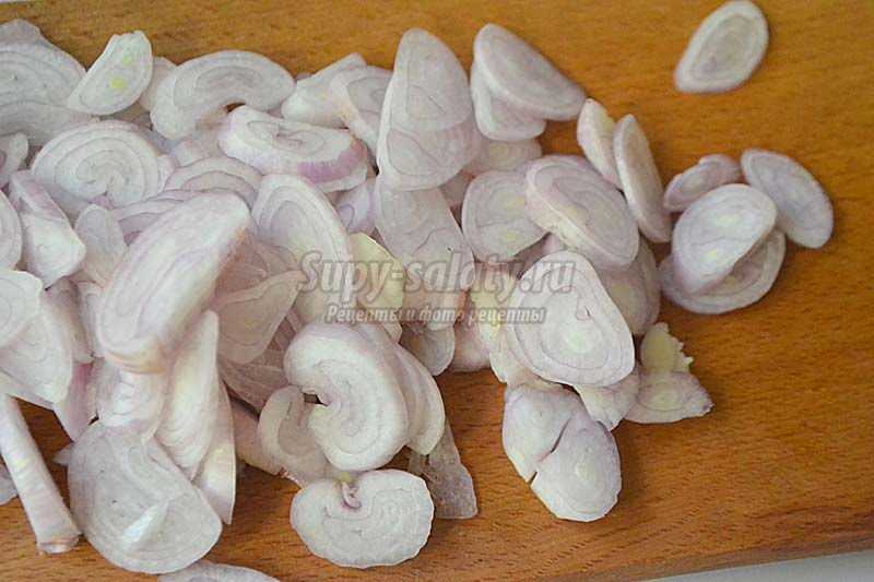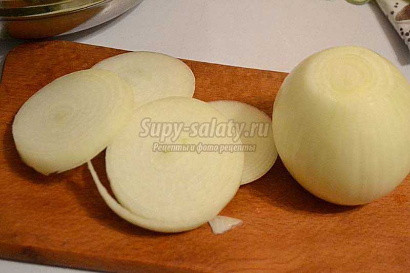 - Лук нужно будет очистить от кожуры, помыть и порезать кольцами или полукольцами.