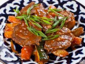 Говяжья печень на мангале с пряным соевым соусом и нежной морковью понравится любителям оригинальных, необычных блюд, приготовленных на костре. Можно использовать любой другой овощ на свое усмотрение – спелые помидоры, баклажаны, кабачки, болгарский перец.