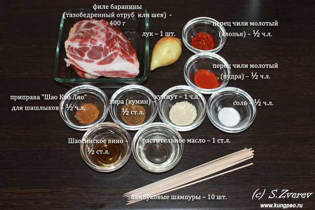 ИНГРЕДИЕНТЫ (на 2-3 порции): филе баранины (тазобедренный отруб или шея) — 400 г, репчатый лук – 1 шт., Шаосинское вино – ½ ст.л., зира (кумин) – ½ ст.л., перец чили молотый (пудра) – ½ ч.л., перец чили молотый (хлопья) – ½ ч.л., соль – ½ ч.л., белый жареный кунжут – 1 ч.л., приправа «Шао Као Ляо» для шашлыков (для барбекю) – ½ ч.л., растительное масло – 1 ст.л., бамбуковые шампуры – 10 шт.