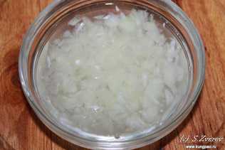 Луковицу почистить и нарезать на сегменты, а затем измельчить до пюреобразного состояния в блендере. Добавить немного воды в луковое пюре, перемешать, а затем отцедить жидкость от лукового пюре.
