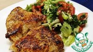 Снимаю с огня и даю отдохнуть, можно накрыть мясо фольгой на 2-3 минуты, так оно пустит сок и будет сочнее. В качестве гарнира салат из помидора, огурца, листьев салата и укропа, заправленный оливковым маслом.
