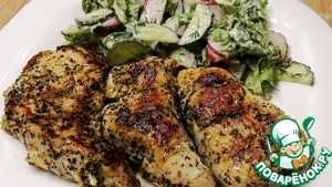 Стейки в зеленом маринаде обжариваю на разогретой сковороде без добавления масла, по 5-7 минут с каждой стороны до появления золотистой корочкой, снимаю с огня и даю отдохнуть. В качестве гарнира салат из редиса, огурца, листьев салата, укропа и зеленого лука, заправленный сметаной.