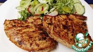 Стейки в красном маринаде обжариваю на разогретой сковороде без добавления масла, по 5-7 минут с каждой стороны до появления золотистой корочкой, снимаю с огня и даю отдохнуть. В качестве гарнира салат из редиса, огурца, листьев салата и лука порей, заправленный подсолнечным, нерафинированным масло.