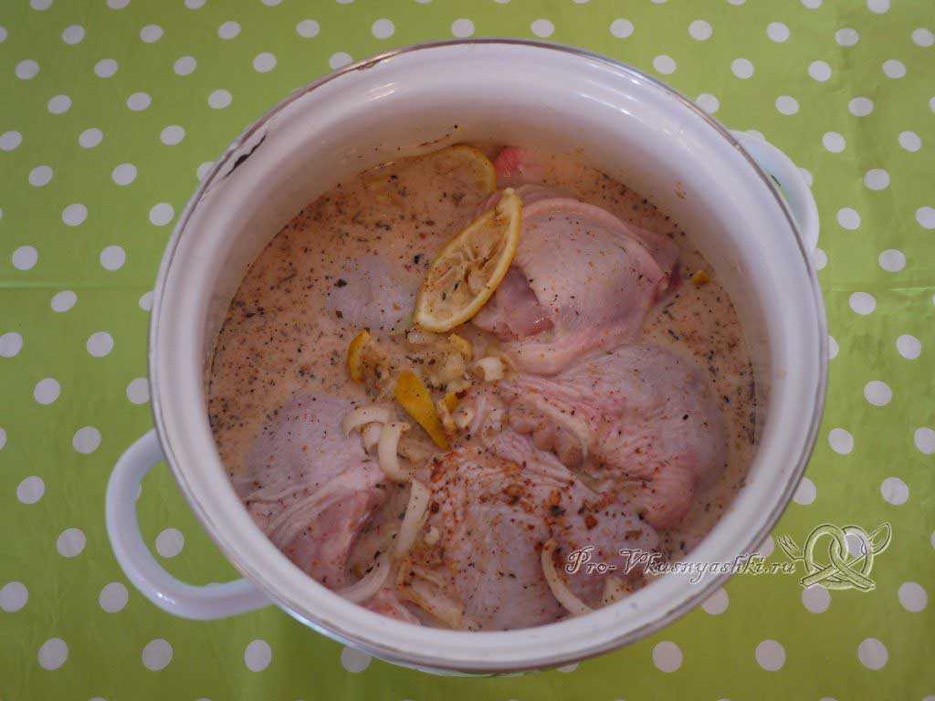 Перемешиваем ингредиенты в кастрюле, добиваясь равномерного распределения всех компонентов. Маринад должен слегка покрывать мясо. В течение 2 ч курица промаринуется и будет готова для жарки.