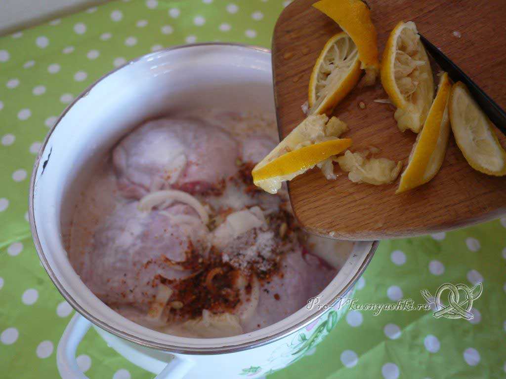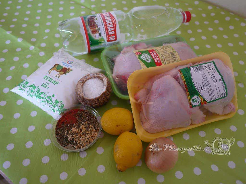 Подготовим ингредиенты. Курицу извлекаем из упаковки. Промываем мясо и лимоны под струей холодной воды. Луковицу чистим от кожуры. Так как мясо птицы более жесткое, чем, например, свинина, то жирность кефира должна быть не менее 2,5 %.