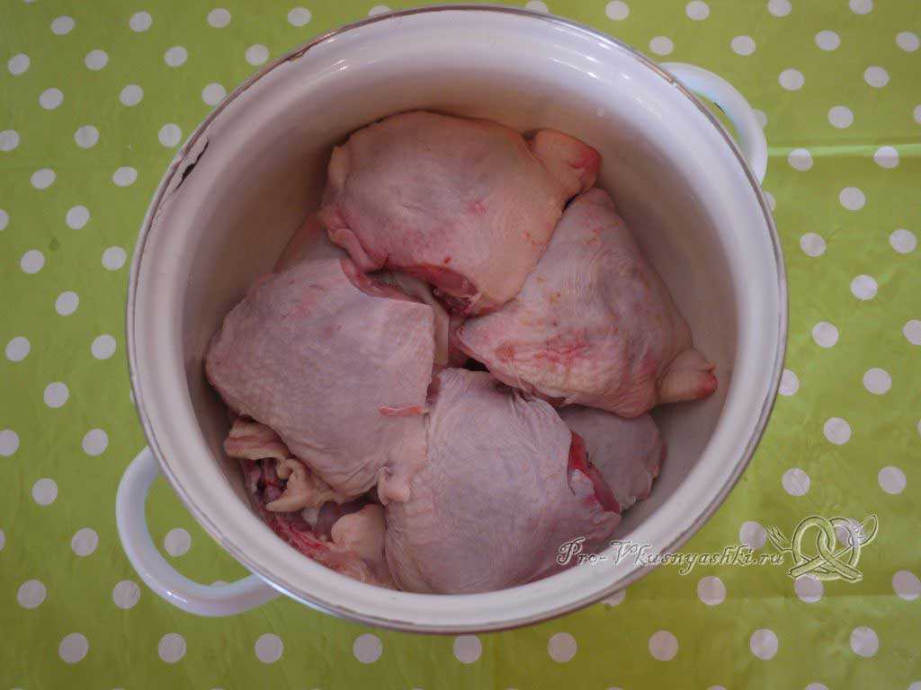Помещаем куриные бедрышки в кастрюлю достаточного объема. Туда же выливаем газированную минеральную воду (1 ст) и кефир (1 ст).