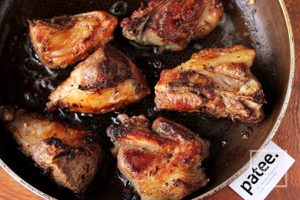Обжариваем мясо со всех сторон до румяной корочки и полной готовности. Регулируем интенсивность огня плиты, чтобы мясо успело прожариться внутри и не пригорело снаружи.