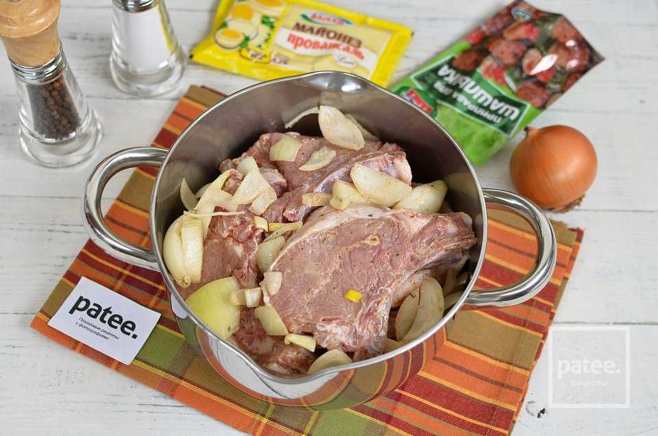 Мясо сложите в кастрюльку. Ни в коем случае не используйте алюминиевую посуду! Посолите, поперчите, добавьте шашлычную приправу (она продается в магазине) и лук, который предварительно нужно почистить, помыть и произвольно порезать крупными кусочками. Так же добавьте майонез и все хорошо перемешайте. Оставьте мариноваться в прохладном месте на 6 ч. Периодически перемешивайте мясо. За 6 ч. маринования, примерно 2-3 раза.