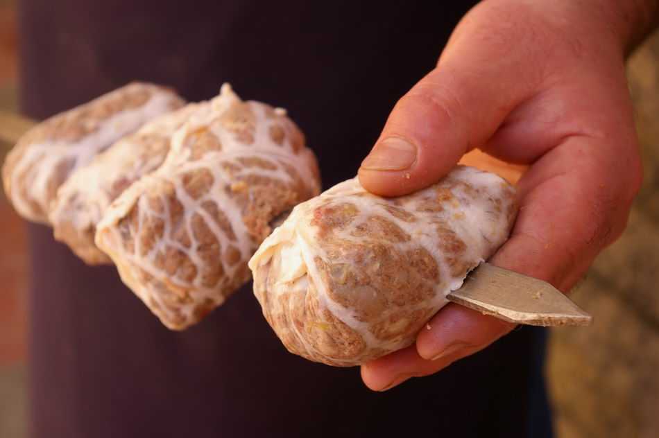 Сам процесс упаковки шашлыка по-хански в жировую сетку напоминает укладку фарша для голубцов — в капустный лист. Здесь уже каждый делает, как ему больше нравится. Главное, чтобы свернутые колбаски не раскрылись до начала самой активной фазы жарки, спекания.